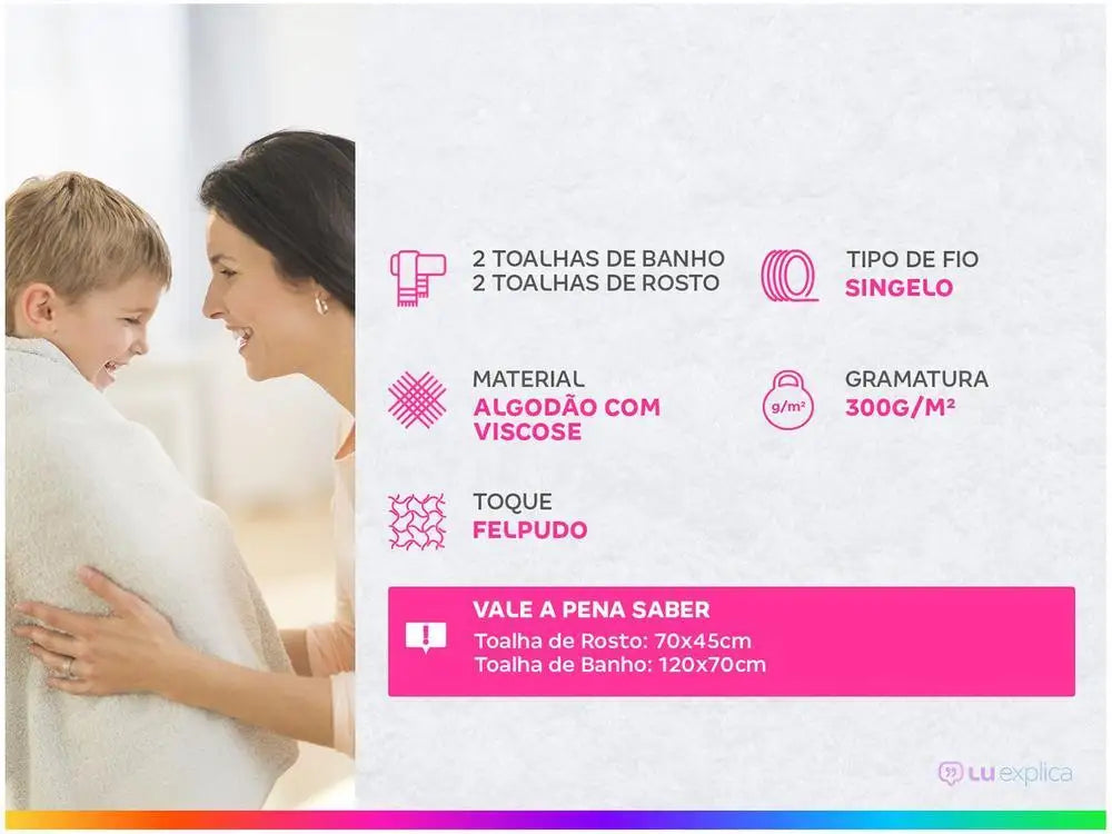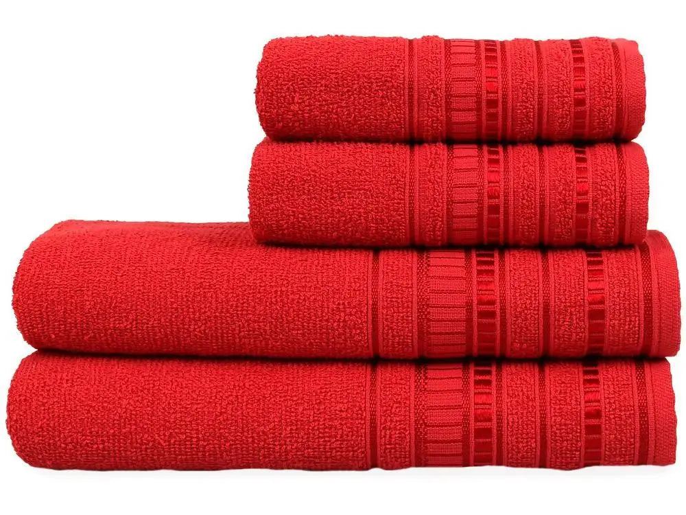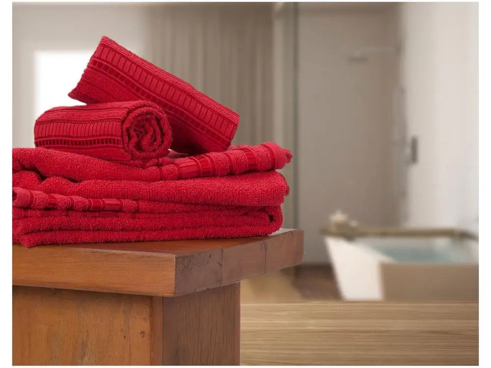 A Atlântica apresenta as toalhas Garden Delicata na cor Valentino. O conjunto é feito em 96% algodão e 4% viscose, com gramatura de 300 g/m². O jogo possui quatro peças, sendo duas toalhas de banho e duas toalhas de rosto.