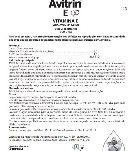 O Avitrin E é um suplemento vitamínico à base de Vitamina E, muito utilizado para aves ornamentais e reprodutoras. Ele é essencial para a fertilidade, reprodução e vitalidade das aves.